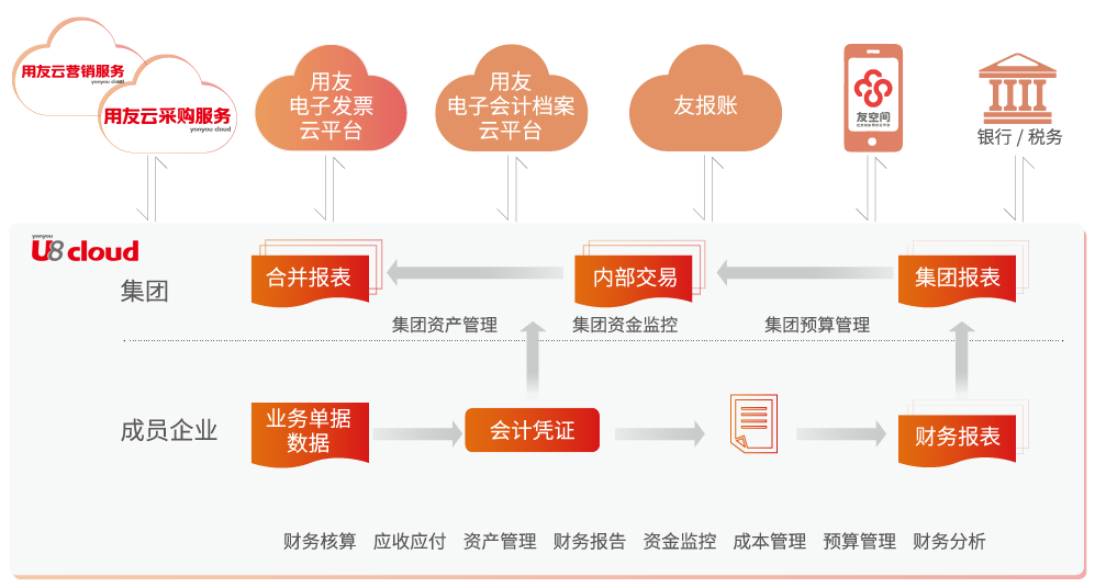 U8 cloud財務(wù)管理應(yīng)用,滿足智能財務(wù)新模式,通過用友云與客戶、供應(yīng)商、服務(wù)商等產(chǎn)業(yè)鏈伙伴進行實時交易和財務(wù)信息共享與傳遞,使多組織企業(yè)的智能化財務(wù)核算、財務(wù)管理與財務(wù)分析更高效