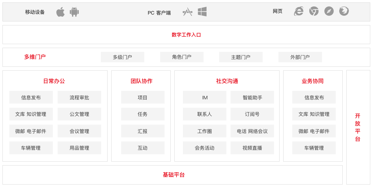 統(tǒng)一企業(yè)多端協(xié)同門戶,消息接收、業(yè)務(wù)處理多端實(shí)時(shí)同步,業(yè)務(wù)處理高效便捷;同時(shí),支持企業(yè)專屬app、企業(yè)主題換膚、個(gè)性化配置web與移動(dòng)門戶布局,讓每個(gè)企業(yè)都可按需自主定制,打造屬于自己的企業(yè)特色。
