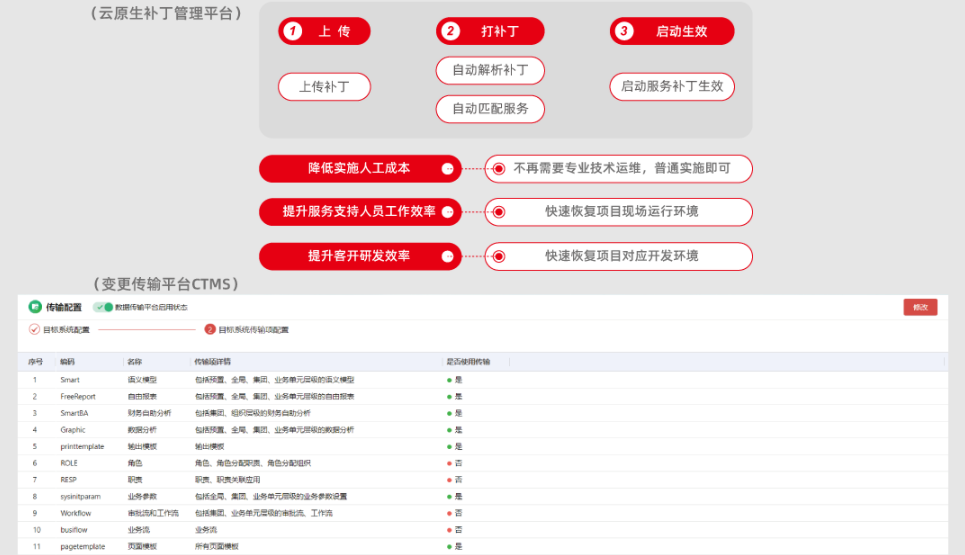 用友NC Cloud提供了可助力企業(yè)在云模式下高效運維的B類工具,通過變更傳輸平臺CTMS、云原生補丁管理平臺,保證業(yè)務(wù)系統(tǒng)的連續(xù)、可靠、一致性,同時縮短項目工期,提升實施、服務(wù)、客開等支持人員的交付效率 。
